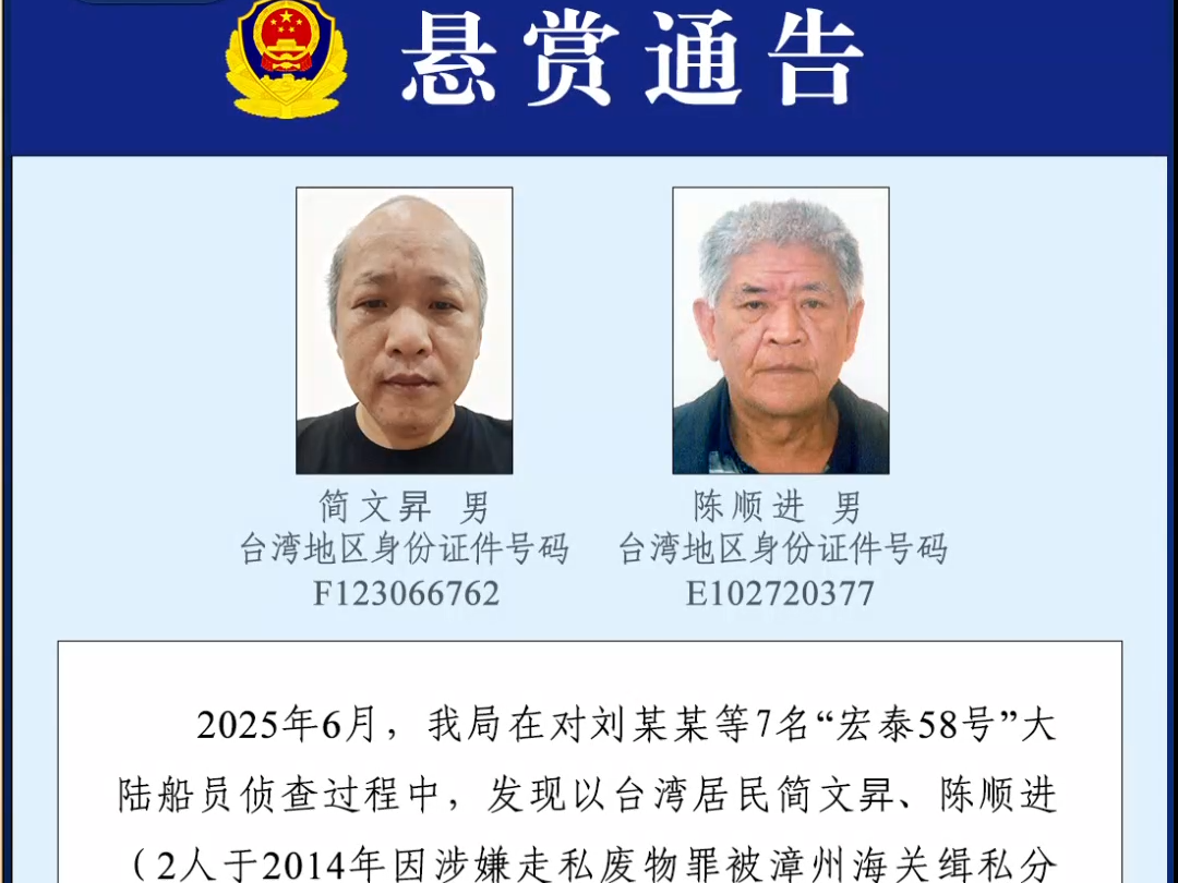 12月24日,山东省威海市公安局发布悬赏通告称,该局6月在对刘某某等7名“宏泰58号”大陆船员侦查过程中,发现以台湾居民简文昇、陈顺进为首的走私犯罪团伙,操控多哥籍“宏泰58号”等多艘船只,长期向大陆走私冻品。