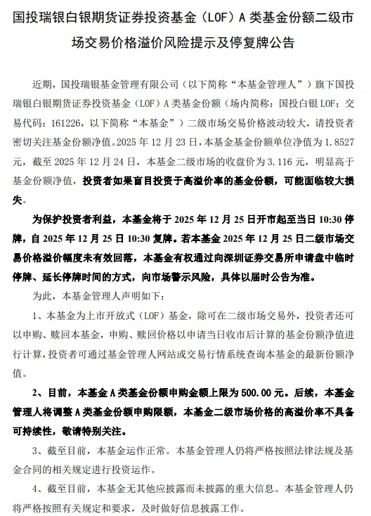 24日盘后,国投白银LOF公告,截至12月24日,本基金二级市场的收盘价明显高于基金份额净值,投资者如果盲目投资于高溢价率的基金份额,可能面临较大损失。为保护投资者利益,本基金将于2025年12月25日开市起至当日10:30停牌,自2025年12月25日10:30复牌。目前,本基金A类基金份额申购金额上限为500.00元。后续,本基金管理人将调整A类基金份额申购限额,本基金二级市场价格的高溢价率不具备可持续性,敬请特别关注。