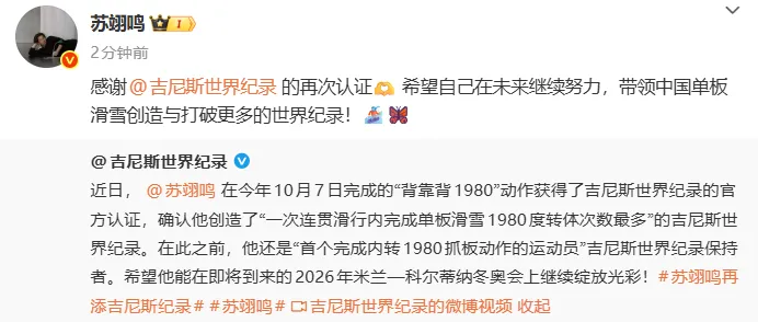随后,苏翊鸣转发并回应:“感谢吉尼斯世界纪录的再次认证,希望自己在未来继续努力,带领中国单板滑雪创造与打破更多的世界纪录!”