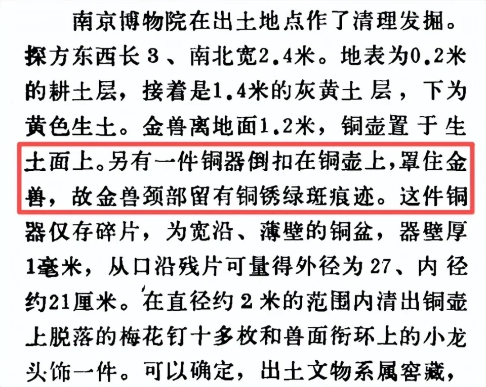 此外,根据《文物》期刊1982年第11期,南京博物院原院长姚迁在《江苏盱眙南窑庄楚汉文物窖藏》一文中提及,出土时,金兽盖在铜壶上,金币贮于铜壶内,取下金兽时,有几块马蹄金还嵌在金兽底部的凹陷处,壶内有少量水汽,没有泥土和积水。金兽离地面1.2米,铜壶置于生土面上。另有一件铜器倒扣在铜壶上,罩住金兽,故金兽颈部留有铜锈绿斑痕迹。