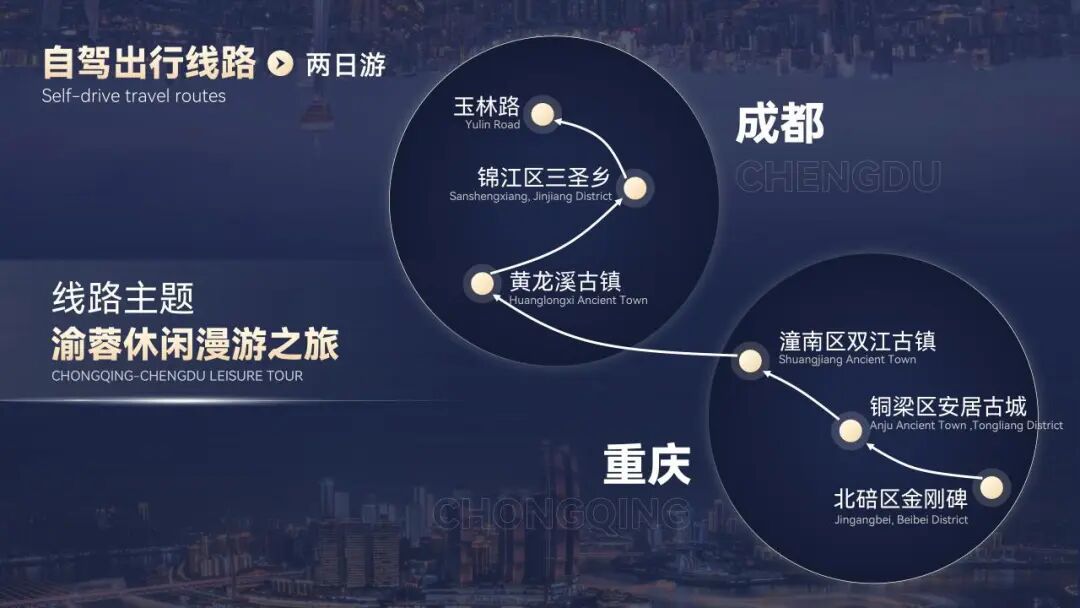 线路:重庆市两江新区江滩公园—重庆市九龙坡区涂鸦一条街—重庆市北碚区缙云山—重庆市合川区钓鱼城—重庆市沙坪坝区渣滓洞白公馆—重庆市沙坪坝区融汇温泉—重庆市大足区大足石刻—资阳市安岳石刻—成都市东部新区三岔湖景区—成都市锦江区cosmo—成都市青羊区宽窄巷子—成都市武侯区抚琴夜市—成都市天府新区兴隆湖湿地公园—成都市天府新区麓湖CPI—成都市双流区彭镇老街—成都市西岭雪山景区—成都市青城山景区—成都市都江堰景区