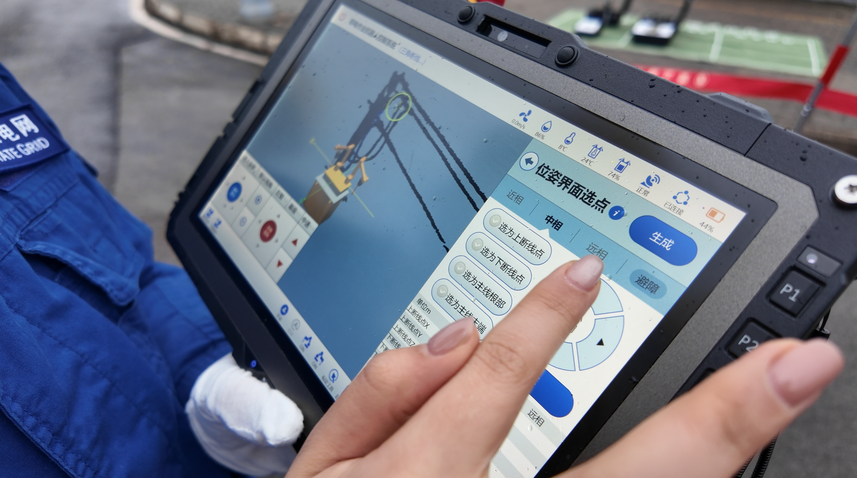 工作人员通过平板向机器人发出作业指令,机器人正在自主识别作业点位