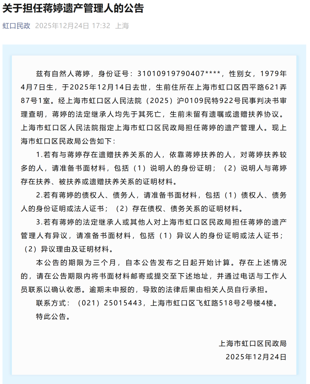 12月24日晚,上海市虹口区民政局发布公告:兹有自然人蒋婷,身份证号:31010919790407****,性别女,1979年4月7日生,于2025年12月14日去世,生前住所在上海市虹口区四平路621弄87号1室。经上海市虹口区人民法院(2025)沪0109民特922号民事判决书审理查明,蒋婷的法定继承人均先于其死亡,生前未留有遗嘱或遗赠扶养协议。上海市虹口区人民法院指定上海市虹口区民政局担任蒋婷的遗产管理人。现上海市虹口区民政局公告如下: