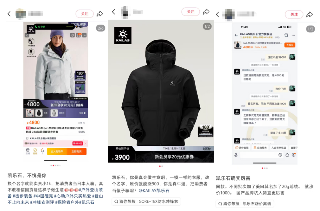 具体来看,凯乐石目前已在网店下架的喀纳斯羽绒服,与新推出的阿尔塔羽绒服外形设计高度相似,核心材料、充绒量等关键配置近乎一致,仅产品名称不同,官方原价却相差900元。有消费者直言“换个名字就涨价”,对价差合理性提出强烈质疑。