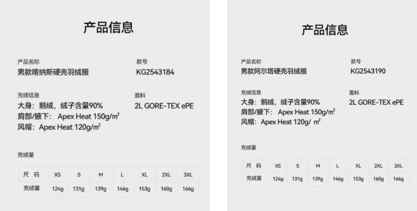 客服人员指出,喀纳斯硬壳羽绒服,采用2L GORE-TEX ePE面料,具备全衣压胶处理,可提供良好的风雨防护;填充物为700FP鹅绒,绒子含量达90%,并在腋下等易潮湿区域嵌入Apex Heat科技棉以增强保暖性能;阿尔塔同样使用了2L GORE-TEX ePE面料增强保暖性能,区别于领口设计,有前倾领型可兼容佩戴围巾,防风弹力袖口有效防止冷风倒灌,填充物为同为700FP鹅绒,绒子含量达90%。