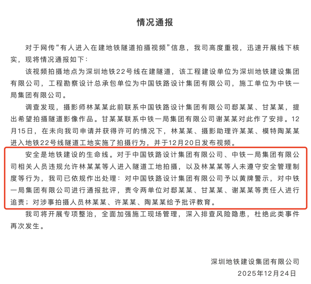 12月24日,深铁建设集团发布情况通报称,12月15日,在未向我司申请并获得许可的情况下,林某某、摄影助理许某某、模特陶某某进入地铁22号线隧道工地实施了拍摄行为,并于12月20日发布视频。公司已依规作出处理:对中国铁路设计集团有限公司予以黄牌警示,对中铁一局集团有限公司进行通报批评,责令两单位对郄某某、甘某某、谢某某等责任人进行追责;对涉事拍摄人员林某某、许某某、陶某某给予批评教育。