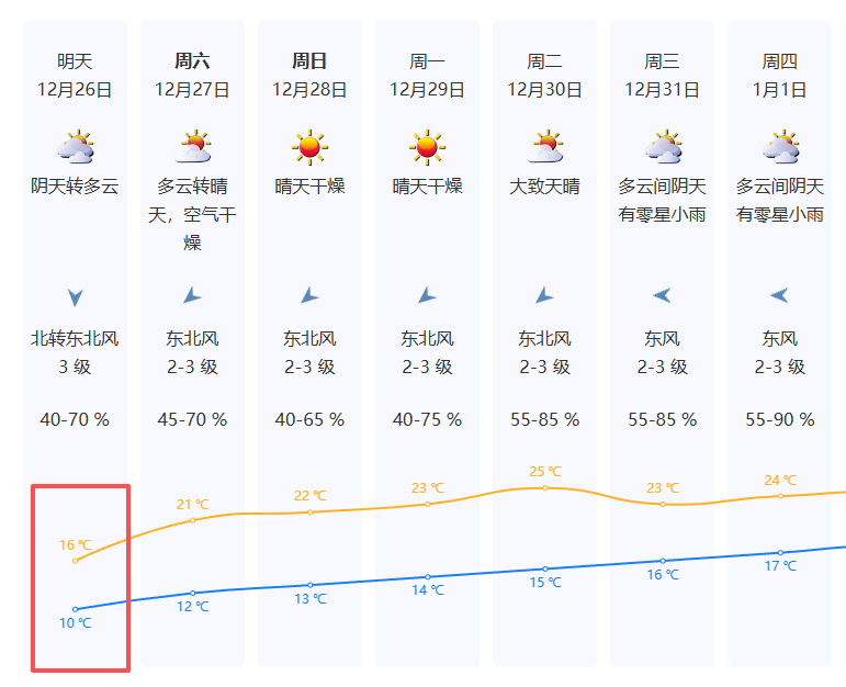 12月26日,最低气温进一步下降至10℃,早晚体感较冷,云量较多,偶有零星小雨,白天风力减弱。