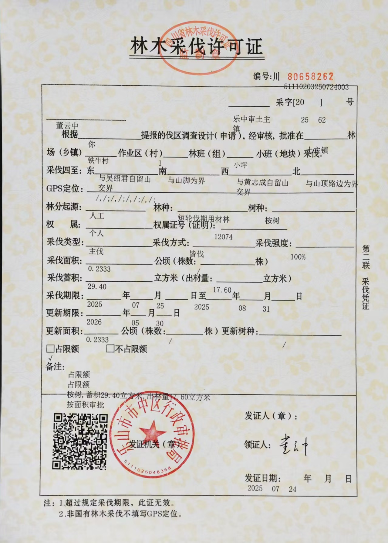 今年7月,乐山市市中区发放首张林木采伐许可证。