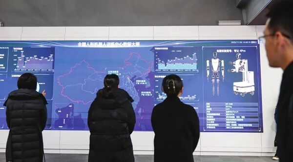 近日,北京人形机器人数据训练中心(二期)展厅,参观者站在大屏幕前,了解全国人形机器人训练中心情况。