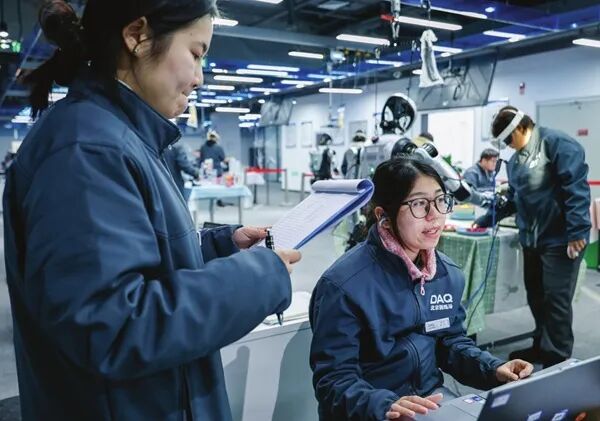 “开始”“结束”“开始”“结束”……近日,在位于北京市石景山区八大处附近的北京人形机器人数据训练中心(二期),20岁的数据采集员史轩煜坐在电脑前,不停下达指令。他的搭档韩伟琪头戴VR(虚拟现实)设备,双手各抓着一只手柄,操控身旁的人形机器人,一次又一次地将一双筷子从“厨房”桌面拿起,稳稳放入筷筒。