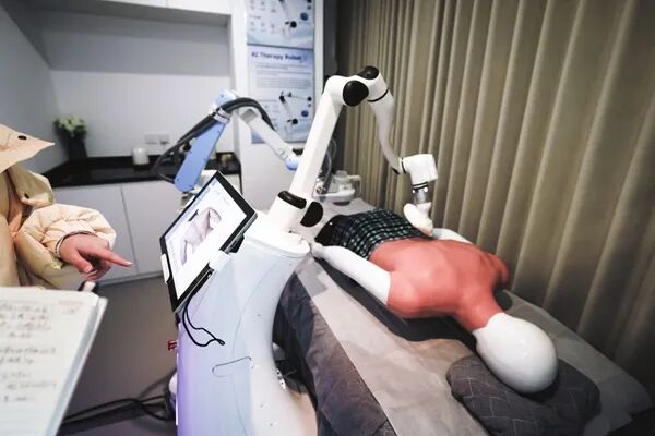 在位于北京首钢园内的北京人形机器人数据训练中心(一期),具身双臂升降机器人、轮式人形机器人、单臂四足仿生机器人等多种形态的机器人在相应场景中接受训练。在家庭康养场景内,一台已经在线下投用的AI(人工智能)按摩机器人尤为引人注目。“基于前期的真实数据积累与后期国医大师的针对性训练,这台机器人集成了AI识别、机器学习、视觉定位、运动控制、力感知等前沿技术,能快速精准地生成按摩轨迹,手法不输经验丰富的理疗师。”训练中心一名运营人员介绍,“我们的最终目标是让机器人真正进入千行百业、千家万户,加速实现机器人服务人类社会的愿景。”