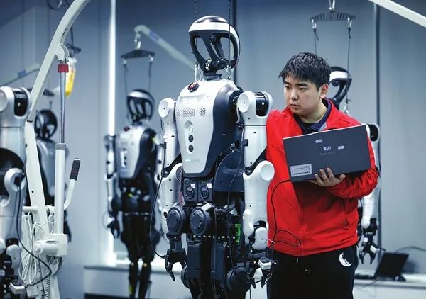 近日,北京人形机器人数据训练中心(二期)一角,机器人维修师在对人形机器人进行设备检修与调试作业。
