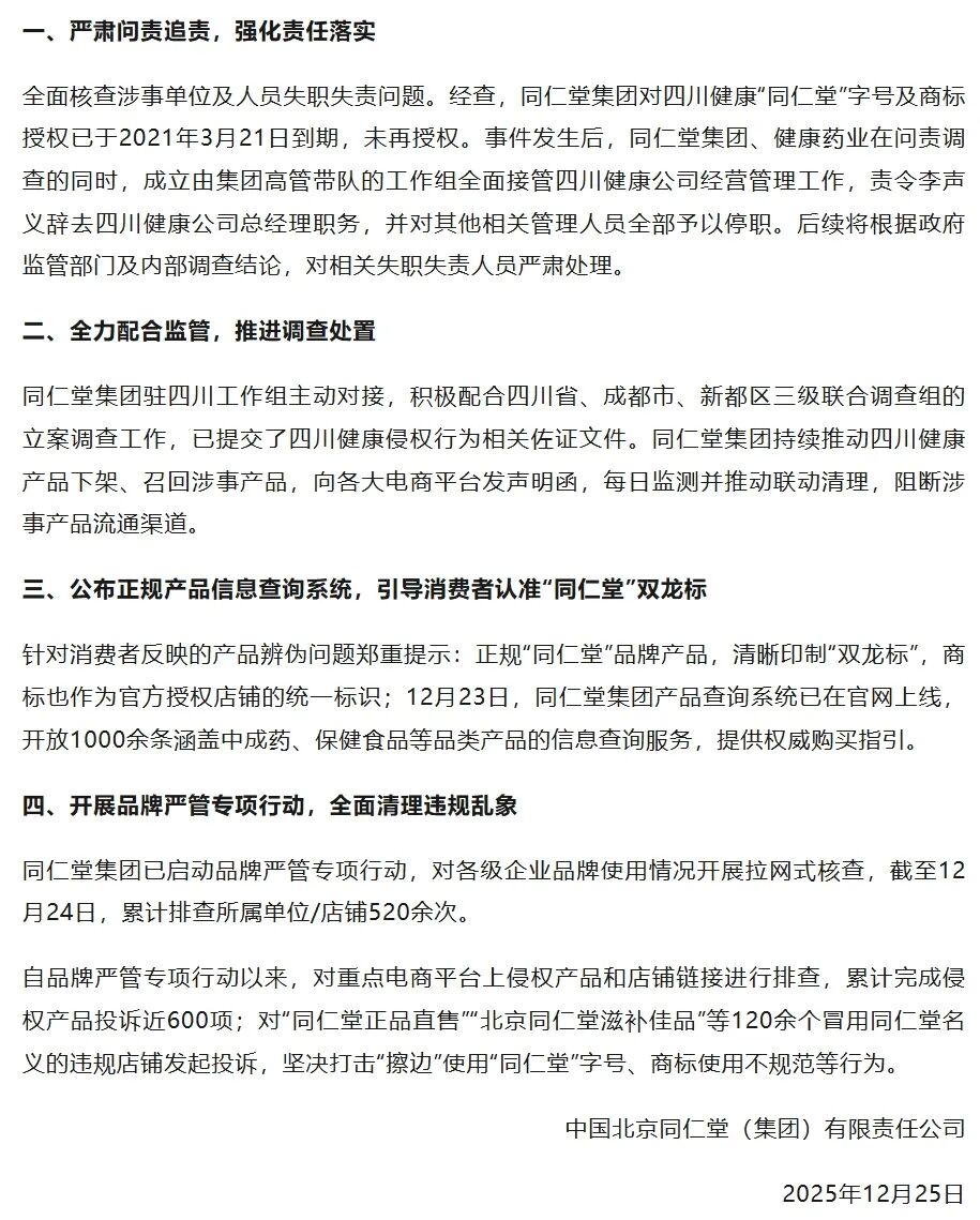 同仁堂集团高度重视全面核查整改工作,近期开展了一系列专项行动: