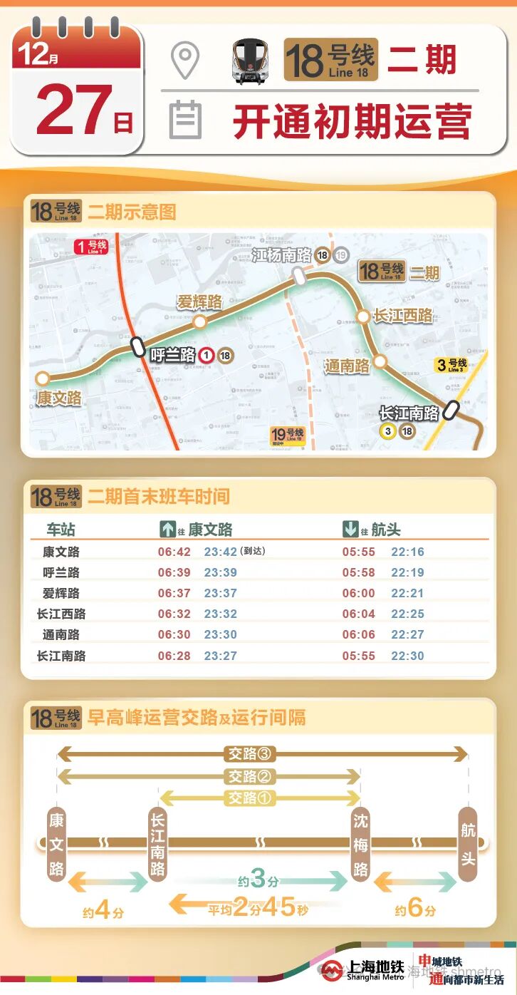 此次18号线二期开通初期运营后,康文路站将作为18号线二期终点站。康文路站发往航头站方向的首班车时间为5:55 ,末班车时间为22:16。同时,原18号线一期终点站长江南路站调整为途经站,长江南路站往航头站方向首班车时间为5:55 ,末班车时间为22:30。长江南路站往康文路站方向首班车时间为6:28 ,末班车时间为23:27。