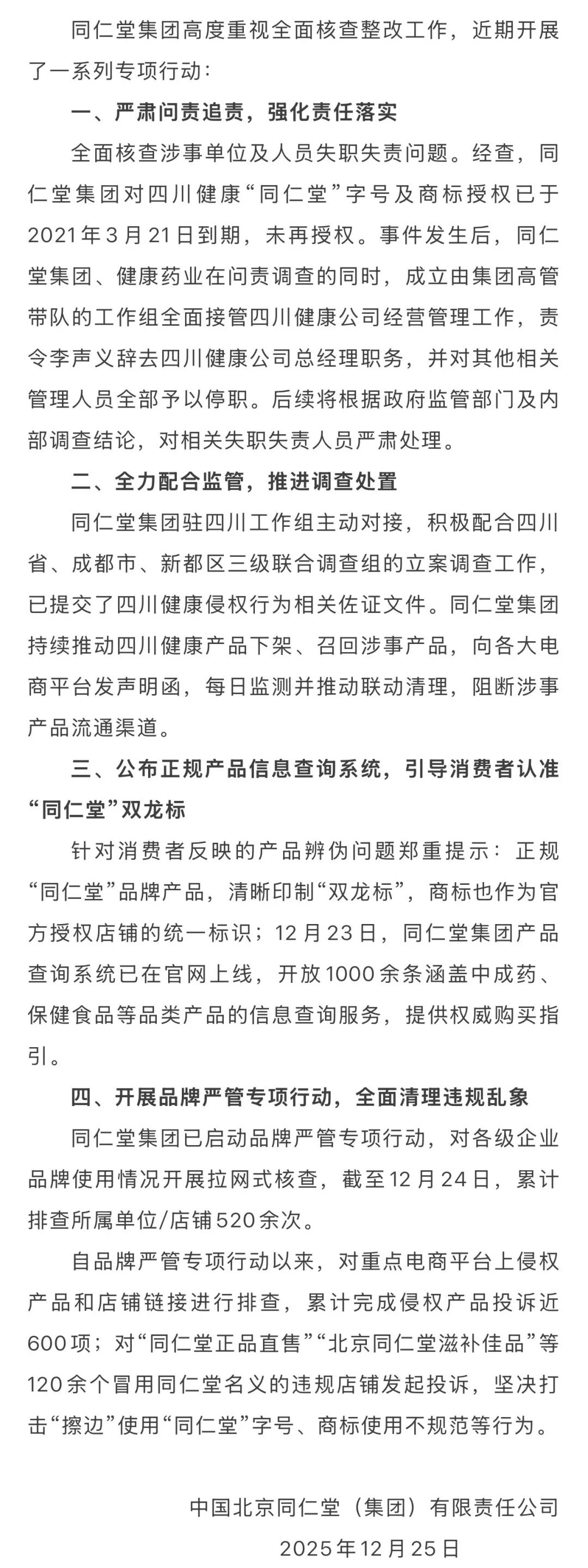 12月25日,北京同仁堂(集团)有限责任公司发布声明称:
