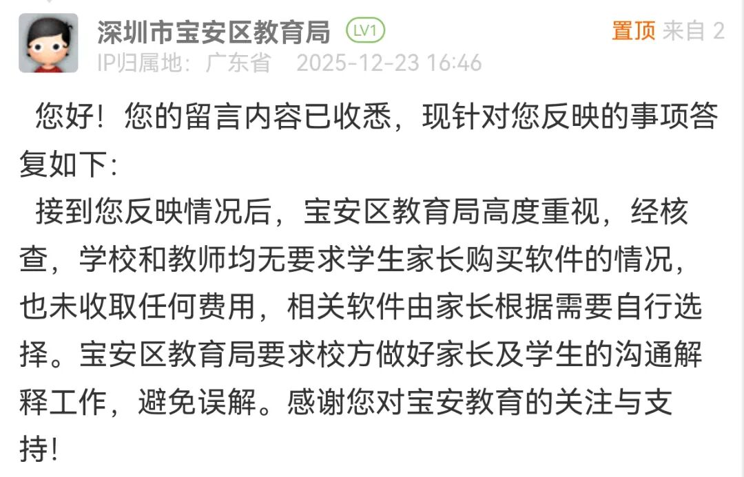 对此,宝安区教育局回复称:经核查,学校和教师均无要求学生家长购买软件的情况,也未收取任何费用,相关软件由家长根据需要自行选择。宝安区教育局要求校方做好家长及学生的沟通解释工作,避免误解。