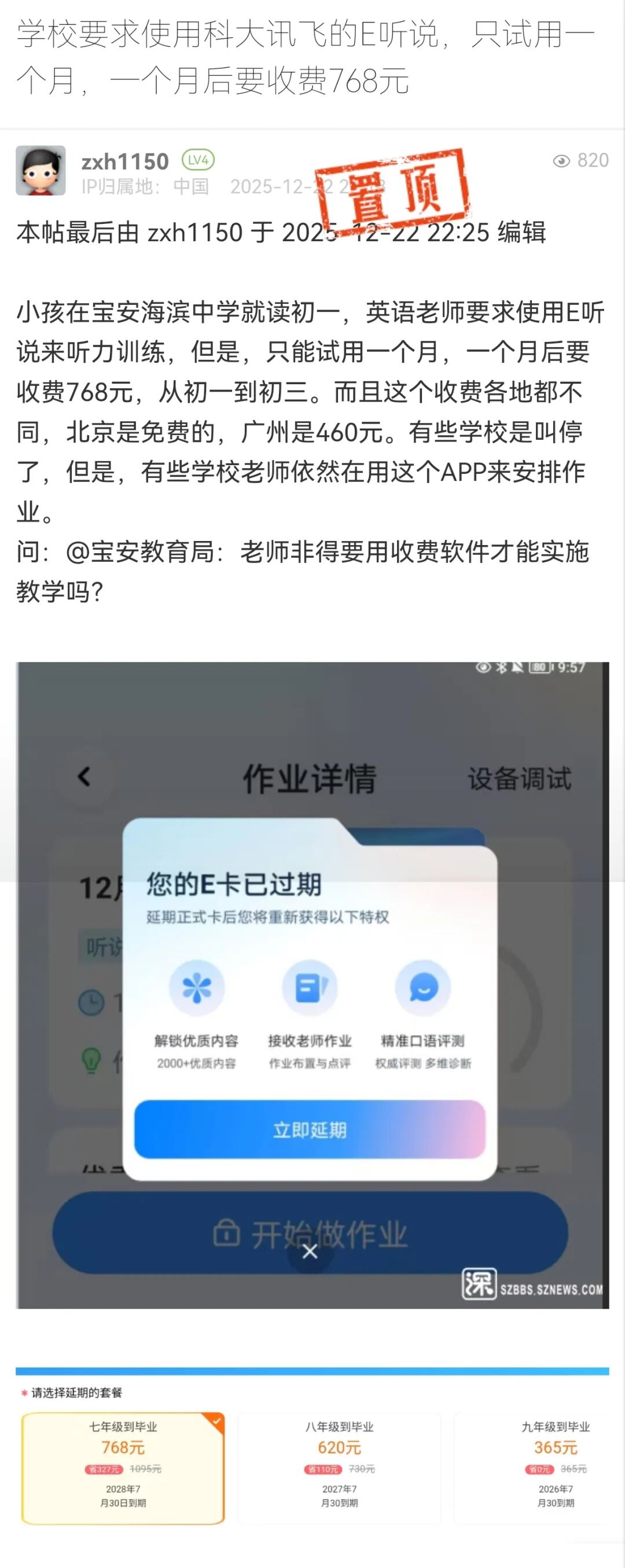 近日,有市民通过《问政深圳》栏目反映称,宝安海滨中学初一英语老师要求使用E听说来听力训练,但是APP只能试用一个月,一个月后要收费768元,因此发出“老师非得要用收费软件才能实施教学吗”的质疑。
