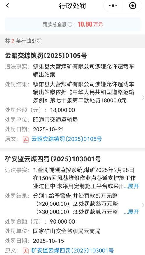 2025年10月15日、10月21日,镇雄县大营煤矿有限公司在一周时间内接连受到两项行政处罚。