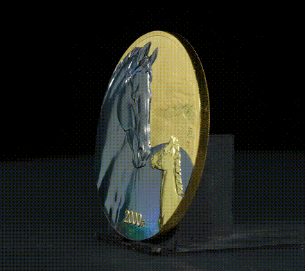 这枚金币以“亲情与守护”为主题,以写实风格呈现一大一小两匹马的深情互动。画面中,成年马占据主体,低头回望,象征着保护与引导;幼马仰头凝视,姿态灵动,神情天真而依赖。双马对视的瞬间构成视觉焦点,强化了彼此的情感纽带。背景以辽阔的草原和蓝天白云共同渲染,烘托出自然的自由氛围,留白与淡灰调表现云层的轻盈,避免喧宾夺主,同时烘托草原的辽阔感。整体构图通过虚实对比与比例差异,既突出主体,又赋予画面叙事性,表达了亲情、传承、自然共生的主题。