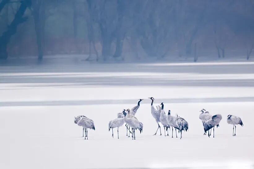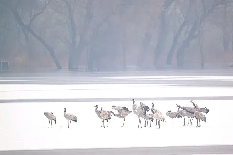 近日,北京喜降瑞雪。在顺义区唐指山水库库区,工作人员在巡查中惊喜发现,16只国家二级保护动物灰鹤在此集群停歇,这是该水库有观测记录以来首次迎来大规模灰鹤种群。
