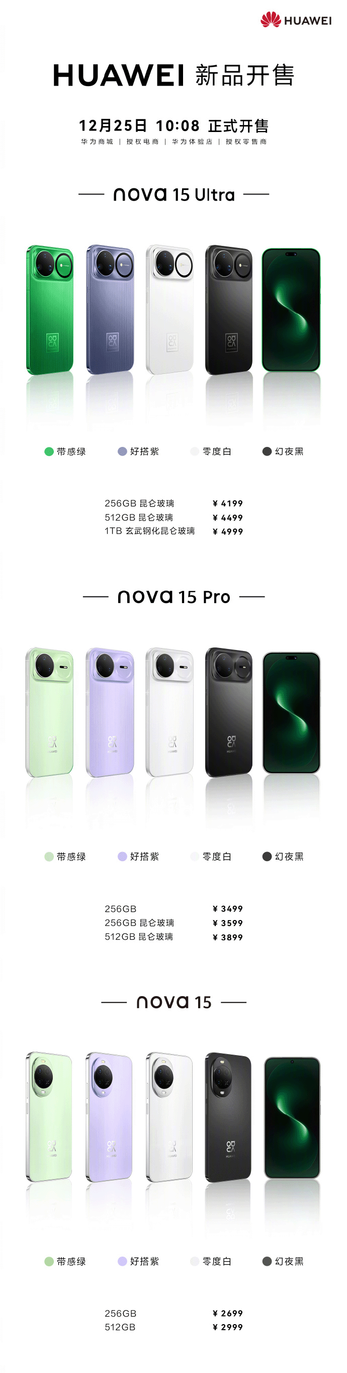 12月25日,华为nova 15系列正式开售,搭载HarmonyOS 6,nova 15售价2699元起,nova 15 Pro售价3499元起,nova 15 Ultra售价4199元起。