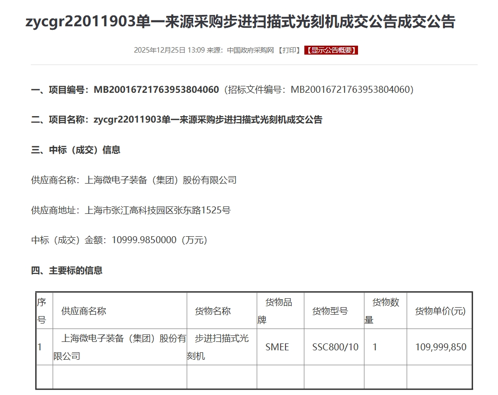 据中国政府采购网公示,上海微电子装备(集团)股份有限公司中标zycgr22011903采购步进扫描式光刻机项目,设备数量为一台,成交金额10999.985万元。