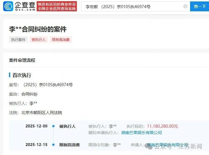 12月25日,话题“李宏毅 限高”冲上热搜。据白鹿视频,北京市朝阳区人民法院向李宏毅签发限制消费令,申请人为湖南芒果娱乐有限公司。
