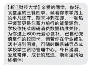 近日,浙江财经大学多名学生收获了“意外”之喜——“饭卡里突然多了600元,本以为是系统错误,看到手机短信才知道,原来这是学校的爱心餐补!”