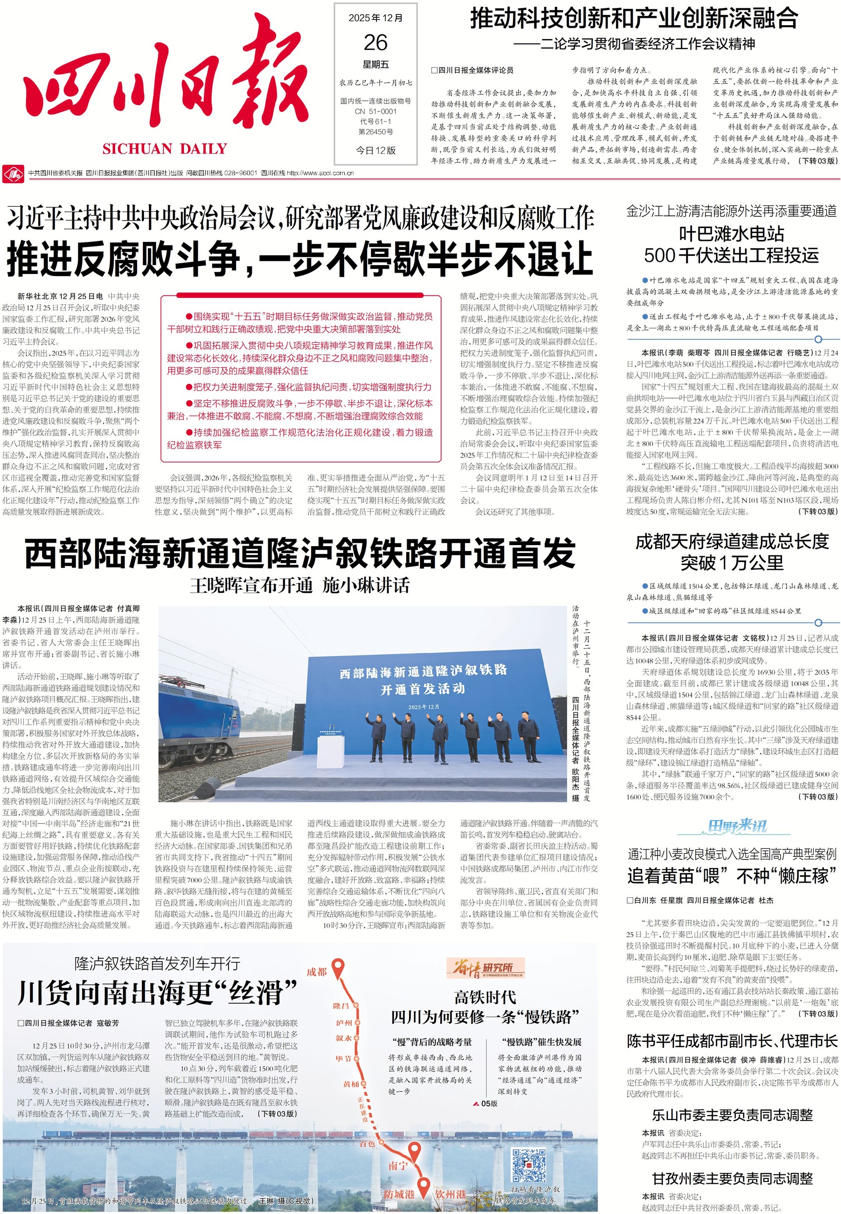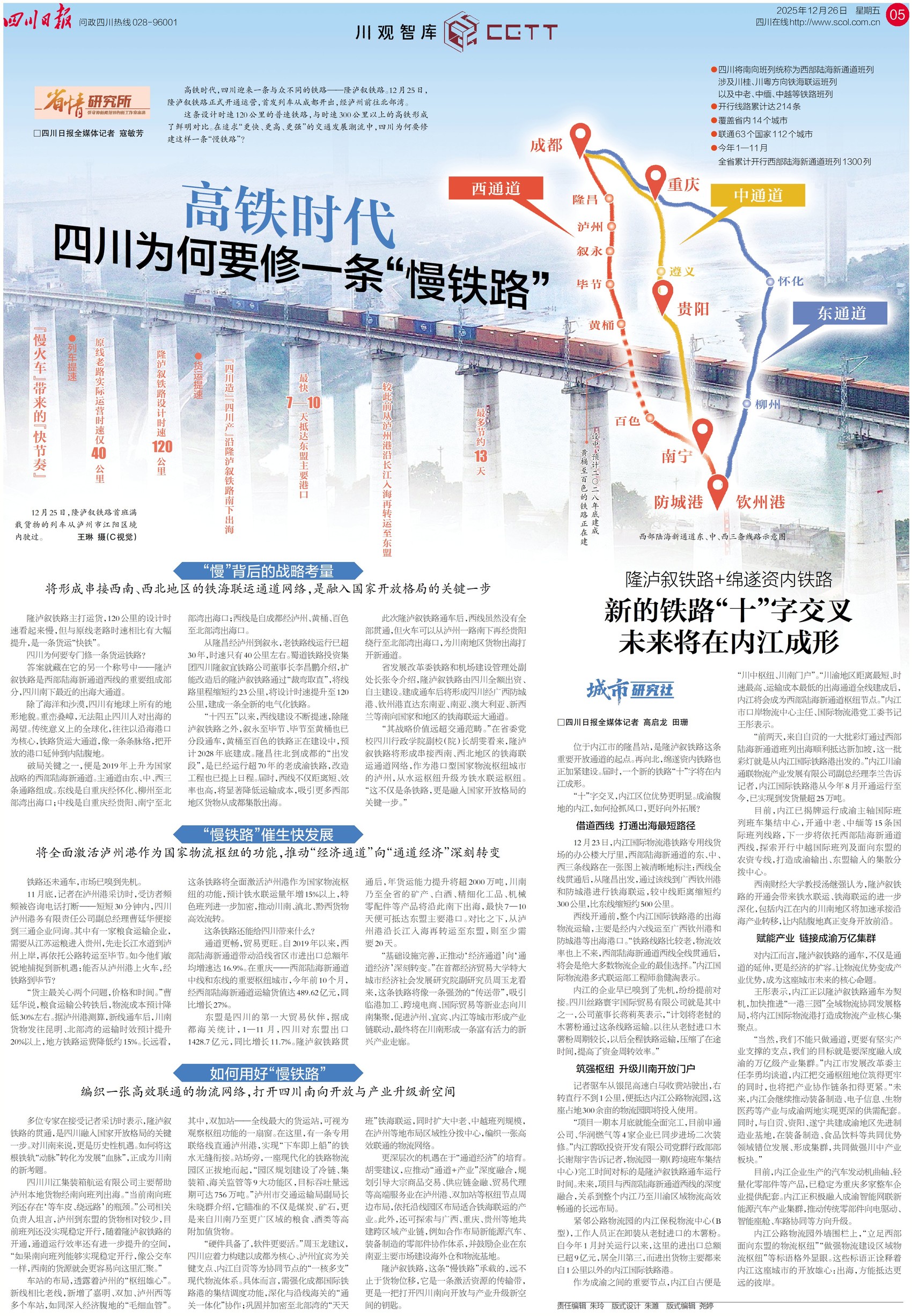 昨天早上10点30分,在泸州,随着一声汽笛长鸣,首发列车稳稳启动、驶离站台,西部陆海新通道隆泸叙铁路正式开通。隆泸叙铁路是在既有隆昌至叙永铁路基础上扩能改造而成,比老线路更直、速度更快,川货南向出海将变得更“丝滑”。不过与时速300公里以上的高铁相比,时速只有120公里的隆泸叙铁路显得有些慢。高铁时代,四川为何要修一条“慢铁路”?请关注今天一版、五版。