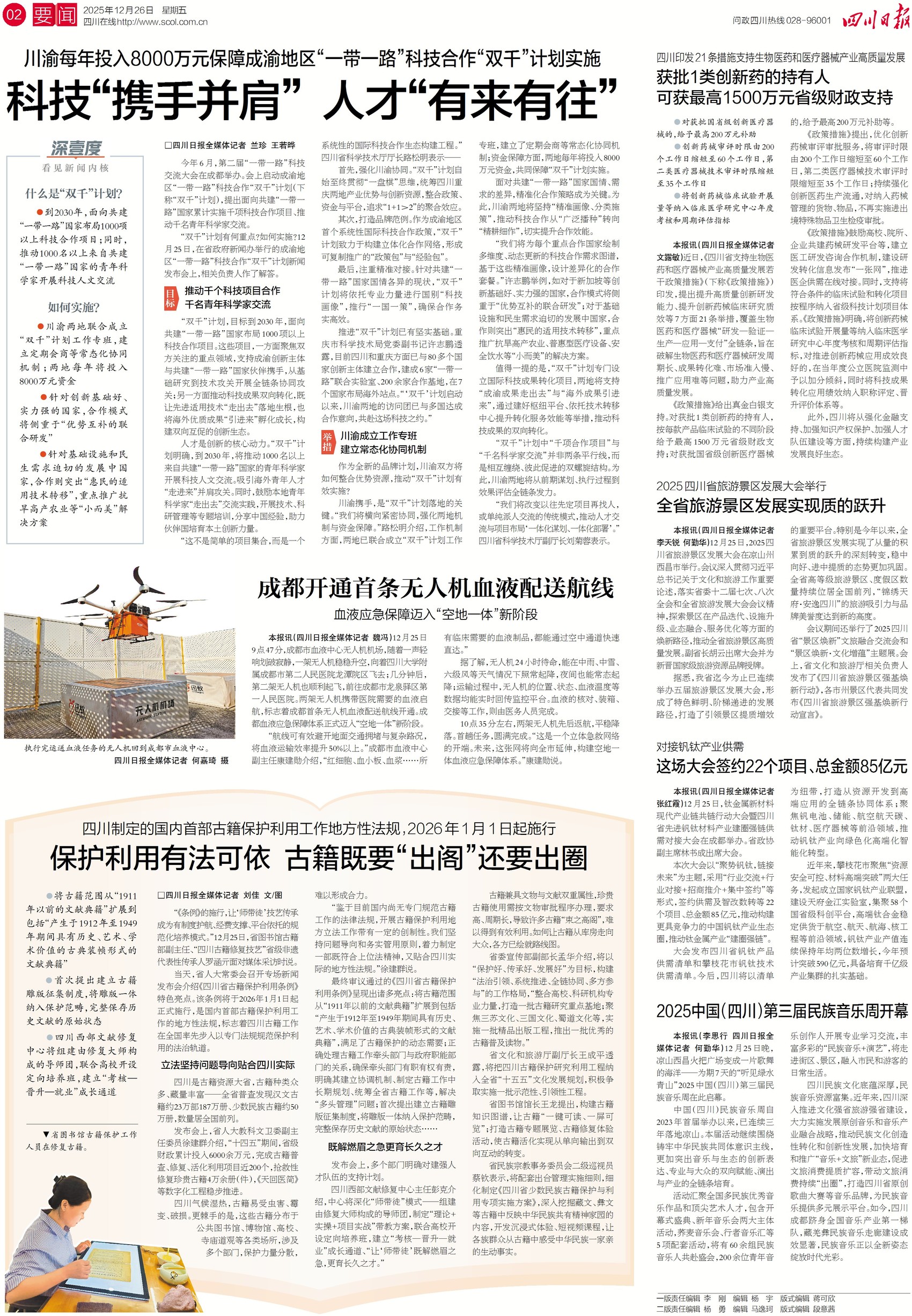 当天差不多时候,在成都市血液中心无人机机场,随着两架无人机携带医院需要的血液启航,成都首条无人机血液配送航线开通。无人机配送,航线避开拥堵的车流与复杂路况,可将血液运输效率提升50%以上。这条航线还有哪些特点?答案在今天二版。
