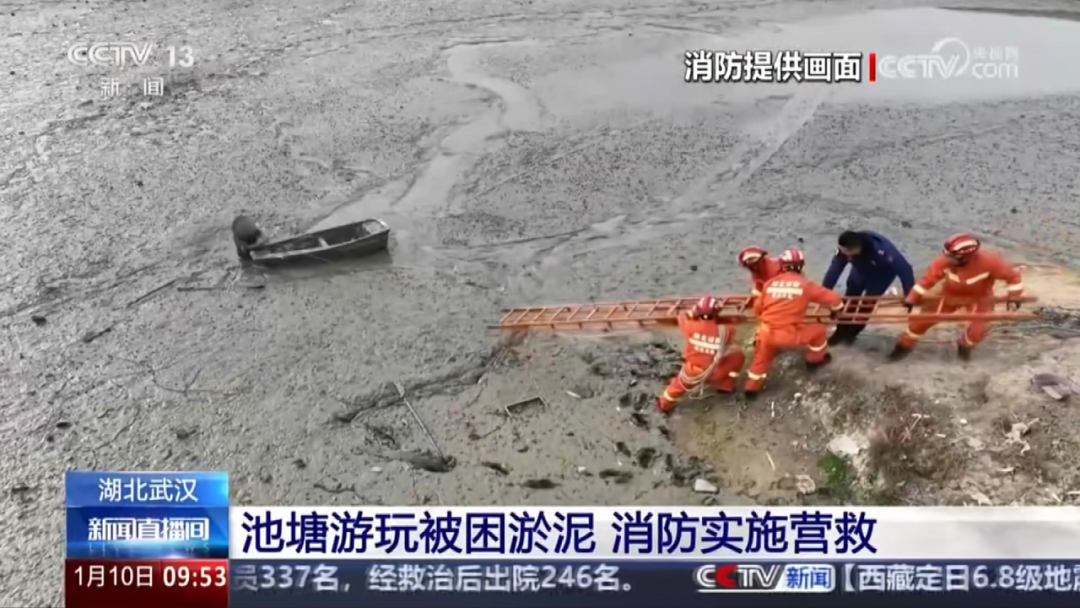 1月10日:CCTV-13《新闻直播间》报道黄陂消防救援大队对池塘游玩被困淤泥者实施营救。