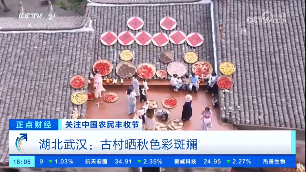 9月23日:CCTV-13《新闻直播间》、CCTV-4《中国新闻》、CCTV-2《正点财经》、CCTV-1《晚间新闻》多个央视频道聚焦黄陂大余湾,生动呈现一幅“晒秋”与稻田收割交织的丰收盛景。