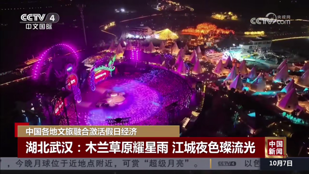 10月7日:CCTV-4《中国新闻》聚焦报道黄陂木兰草原文旅融合激活假日经济:木兰草原耀星雨,江城夜色璨流光。