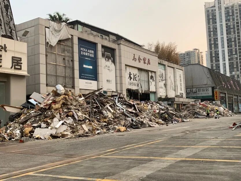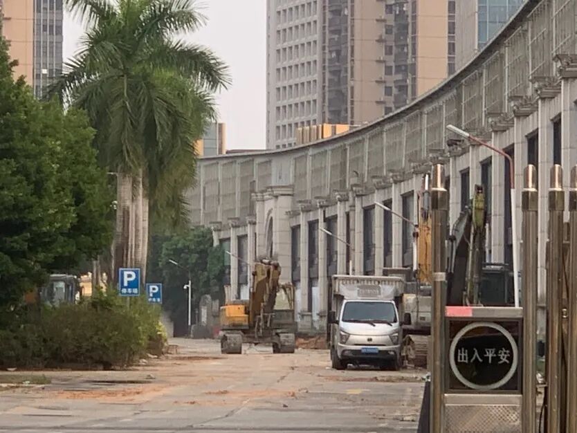 多台勾机和推土机在现场开动,工人在清理残垣断壁和钢筋。现场多个商铺已经拆除,其中有一大片土地已经裸露出来,余泥和钢筋堆成一堆堆。目前地块南面的马会家居和汽车城部分清拆进度较快。