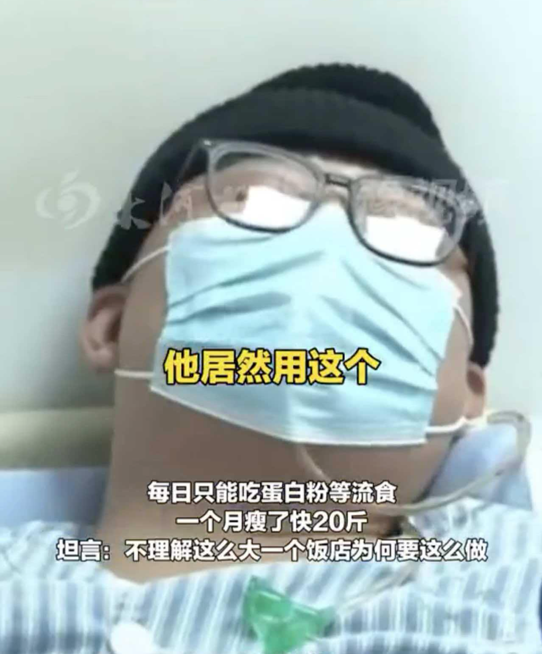 当晚与餐馆沟通后才得知饮用了84消毒液清洗过的水壶倒出来的水。自己食道腐蚀受损后,每日只能吃蛋白粉等流食,一个月瘦了快20斤。