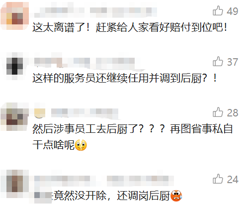 事发后,辖区市监所已到店检查工作,店方已进行整改,涉事女员工50多岁,已作出深刻检讨,并调岗到后厨。