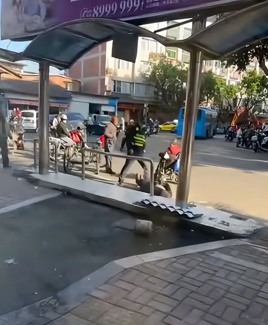 视频显示,在街道上,一位老人走下台阶,迎面跑来一名身着城管制服的工作人员,靠近后将老人推倒。