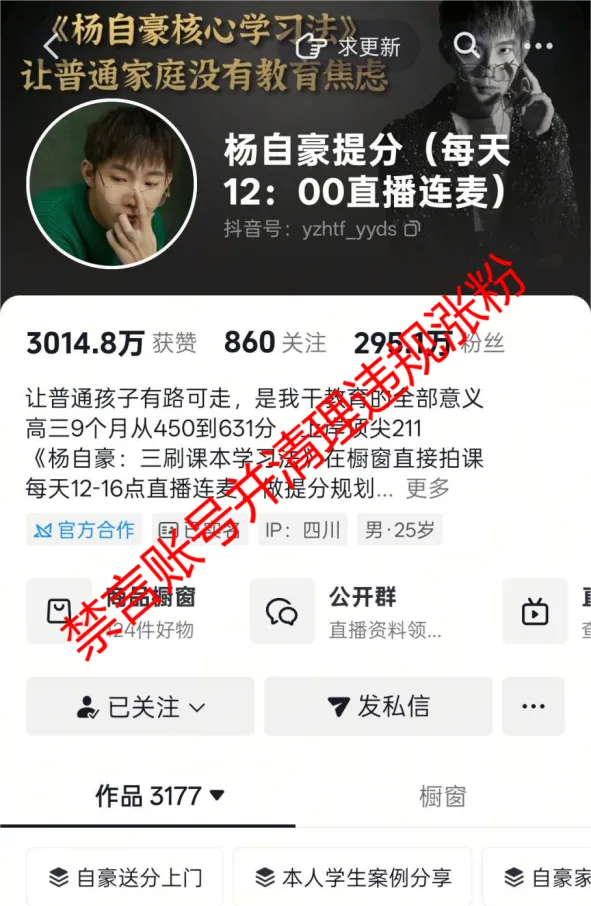 抖音账号“杨自豪提分”、快手账号“杨自豪提分”、小红书账号“杨自豪提分咨询”在教育领域“贩卖”焦虑带货卖课,造成恶劣影响。涉及的账号已依法依约处置。