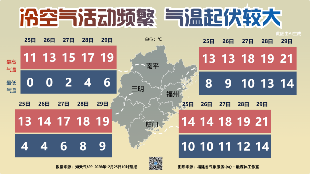 26日早晨,南平西部北部、宁德西部北部、三明西北部最低气温可达-2~0℃,有结冰,南平东南部、宁德东南部、三明东部南部、龙岩西部、福州北部、泉州西北部城区最低气温0~4℃,有霜或霜冻,其余地区5~10℃。