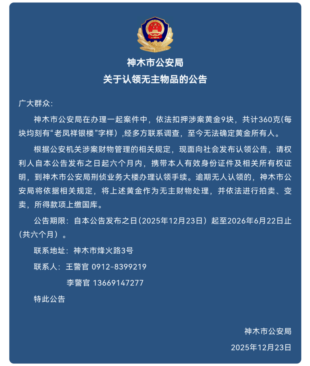 根据公安机关涉案财物管理的相关规定,现面向社会发布认领公告,请权利人自本公告发布之日起六个月内,携带本人有效身份证件及相关所有权证明,到神木市公安局刑侦业务大楼办理认领手续。逾期无人认领的,神木市公安局将依据相关规定,将上述黄金作为无主财物处理,并依法进行拍卖、变卖,所得款项上缴国库。