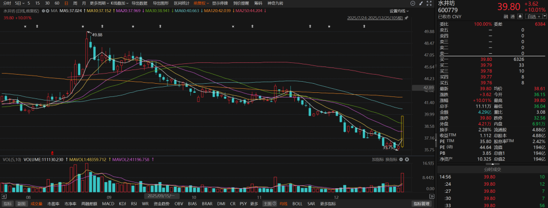 二级市场上,水井坊今日收盘涨停。据悉,今日市场传出“剑南春拟收购水井坊”的消息。据媒体报道,记者就此事分别采访水井坊与剑南春相关人士,双方均回应未收到相关收购信息。