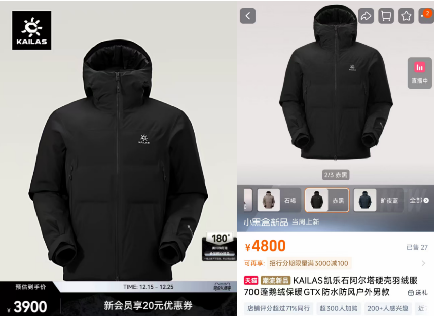具体来看,凯乐石目前已在网店下架的喀纳斯羽绒服,与新推出的阿尔塔羽绒服外形设计高度相似,核心材料、充绒量等关键配置近乎一致,仅产品名称不同,官方原价却相差900元。有消费者直言“换个名字就涨价”,对价差合理性提出强烈质疑。