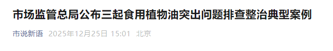 记者今天了解到,2025年,市场监管总局部署开展食用植物油突出问题排查整治,严厉打击食用植物油掺假掺杂、以次充好、标签虚假标注等违法违规行为,选取部分典型案例予以公布。