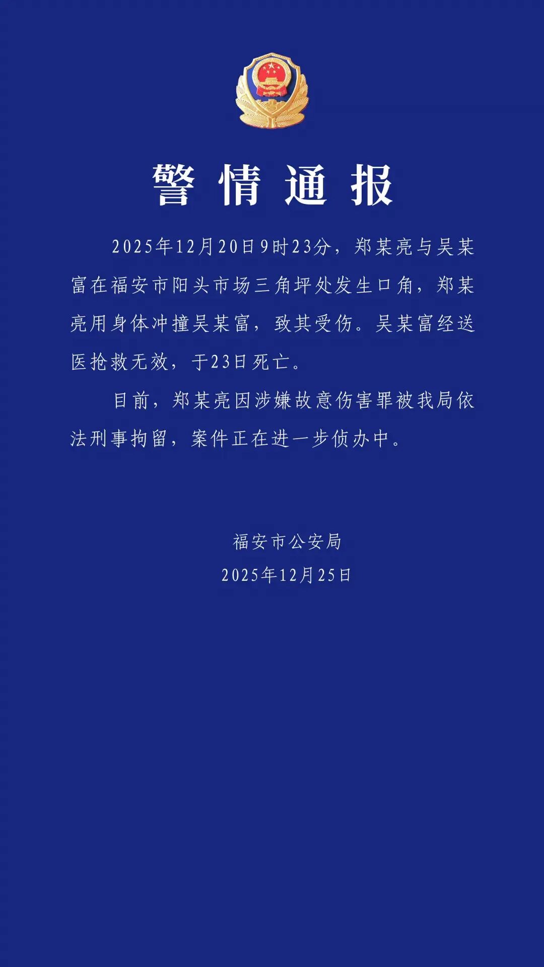12月20日9时23分,郑某亮与吴某富在福安市阳头市场三角坪处发生口角,郑某亮用身体冲撞吴某富,致其受伤。吴某富经送医抢救无效,于23日死亡。目前,郑某亮因涉嫌故意伤害罪被依法刑事拘留,案件正在进一步侦办中。
