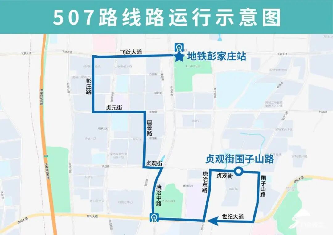 507路由地铁彭家庄站开往贞观街围子山路,主要途经飞跃大道、彭庄路、贞元街、唐景路、贞观街、唐冶中路、世纪大道,然后单向沿唐冶东路向北、贞观街向东、围子山路向南至世纪大道向西恢复原线,沿途设置地铁彭家庄站、飞跃大道唐冶西路、和唐悦色小区、彭庄路益新街、唐城小区北(路南)、贞元街唐和路、香树花城小区、新希望花园小区、世纪大道唐冶中路(路南)、地铁唐冶站(路东)、历城文博中心、唐冶东路世纪大道(路东)、高铁城(路南)、贞观街围子山路(路南)、围子山路贞观街(路西)、围子山路世纪大道(路西)、世纪大道围子山路(路北)站点。