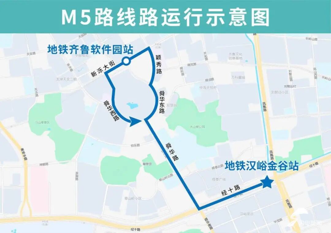 M5路由地铁汉峪金谷站开往地铁齐鲁软件园站,主要途经经十路、舜华路,然后单向沿舜华东路向北、颖秀路向北、新泺大街向西、舜华西路向南至舜华路向南恢复原线,沿途设置地铁汉峪金谷站、地铁舜泰广场站、舜华路南口、舜华路伯乐路、齐鲁软件园东(路东)、颖秀路舜风路(路东)、地铁齐鲁软件园站(路北)、舜华西路(路西)、齐鲁软件园(路南)站点。
