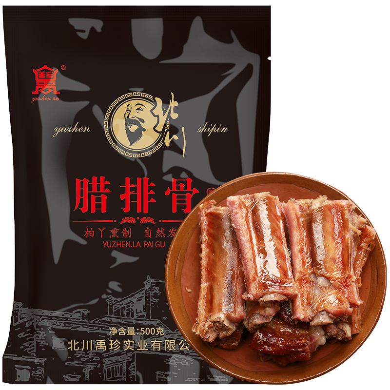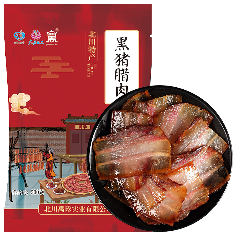 北川禹珍选用高山海拔1200米以上散养的跑山黑猪肉,均匀涂抹了炒热的盐拌着花椒、胡椒、茴香等中药材香料,经两个月自然发酵后,再用生柏树枝和青杠树枝等烟熏后制成。