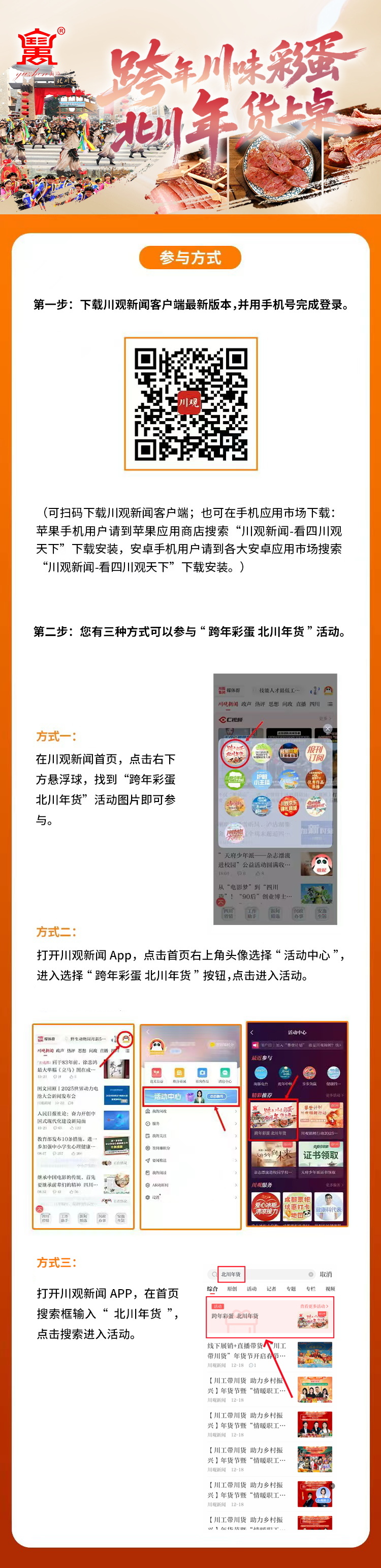本次“跨年川味彩蛋 北川年货上桌”活动,由川观新闻与北川禹珍联合推出。北川禹珍是一家以生态特色养殖、农特产品加工、冷链物流和商贸服务为一体的综合性企业,现为农业产业化省级重点龙头企业、国家高新技术企业、科技型中小企业、省级扶贫龙头企业。此番跨年彩蛋,可是集齐了北川禹珍年货拳头产品!