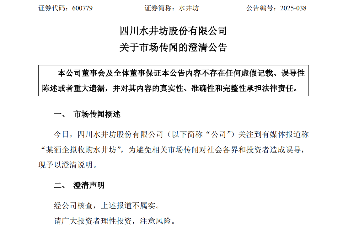 同日晚间,水井坊发布公告称,公司关注到有媒体报道称“某酒企拟收购水井坊”,为避免相关市场传闻对社会各界和投资者造成误导,现予以澄清说明。经公司核查,上述报道不属实。请投资者理性投资,注意风险。
