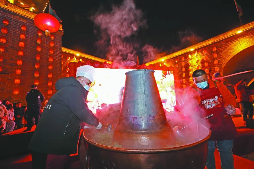 “燃点”也在兴城宁远古城里。以“东北佛跳墙、兴城海鲜酸菜锅”为主题的火锅节,将仪式感拉满。老匠人手持长柄铜勺,在炭火正旺的铜锅里依次铺下金黄的酸菜、透亮的粉条,再将肥美的爬虾、鲜活的螃蟹、饱满的扇贝尽数倒入。浓汤翻滚间咕嘟作响,热气裹着鲜味儿扑面而来。